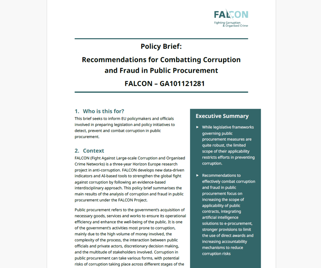 The FALCON project has published its third Policy Brief, offering actionable recommendations to tackle corruption and fraud in public procurement. The brief emphasises the importance of AI-driven tools, enhanced oversight, increased transparency and the use of corruption indicators to strengthen anti-corruption efforts across the EU.